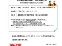 盛夏の候、皆様いかがお過ごしでしょうか。「りぼんの会」も今年度で第13回目となります。様々な職場の情報交換を通して交流を深めませんか?!多くの皆様のご参加をお待ちしております。 日時 令和7年11月1日(土) 13時30分~15時30分 参加費 500円(ケーキ代・コーヒー代) 場所 愛知医科大学看護学部棟1階 N102実習室 ◆お車でお越しの方は,病院の駐車場をご利用ください。 駐車場は,令和7年5月から有料となりました。 200円かかりますこと,ご了承をお願いいたします。◆お子様同伴でも構いませんが, ...