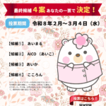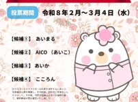 標記について,このたび同窓会では,新たに決定したマスコットキャラクターの名称を決定するにあたり,令和7年11月から令和7年12月末にかけて名称案の公募を実施いたしました。その結果,19件のご応募をいただきました。ご応募いただいた皆様に心より御礼申し上げます。 ついては,同窓会役員による一次選考を経て,最終候補4案を選定いたしましたので,下記のとおり名称の最終投票を実施いたします。 本学の学生・教職員をはじめ,学内外の皆様にご投票いただけますので,ぜひご参加いただき,同窓会の“顔”となるマスコットキャラクタ ...